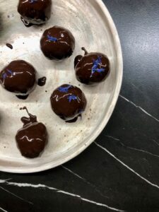 - Dip each truffle into the melted chocolate, ensuring they’re fully covered. Place them on a parchment-lined tray.